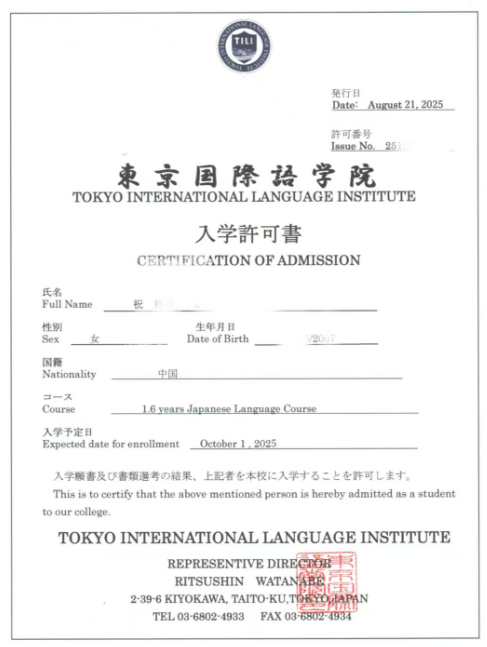 祝铭泽同学目前高三在读,经过规划想赴日留学,在CCE山东招办帮助下,成功被东京国际语学院录取,并获得再留资格,将于2025年10月赴日开启留学生涯!